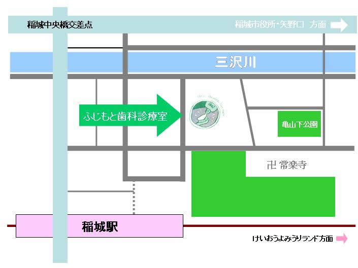 地図は拡大、縮小、スクロールできます。中央の赤いバルーンが当院です。 "サテライト(Satellite)"ボタンを押すと、衛星写真に切り替わります。
